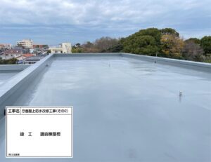 - 芦屋庁舎屋上防水工事着工前 → 竣工 名称 芦屋庁舎屋上防水工事工事 住所 福岡県 芦屋町 概要 改修工事 竣工 令和5年12月