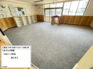 - 子育て支援センタータイルカーペット張替、木製棚改修工事着工前 → 竣工 名称 子育て支援センタータイルカーペット張替、木製棚改修工事 住所 福岡県 芦屋町 概要 改修工事 竣工 令和6年8月
