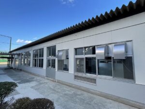 - 東筑高校食堂棟改修工事着工前 → 竣工 名称 東筑高校食堂棟改修工事 住所 福岡県 北九州市 概要 改修工事 竣工 令和3年12月